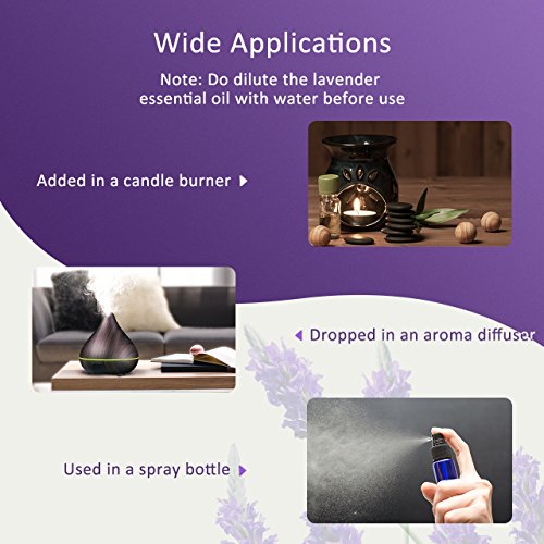 Wide Applications. Add a few drops in an aroma diffuser or put it in a candle burner or simply use it with a spray bottle to enjoy its fragrance and healthy benefits. Note: Do dilute the lavender essential oil with water before using it. Avoid direct contact with skin and eyes.