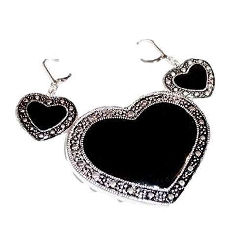 -. Binding : Jewelry -. Brand : Recyclebabe Earrings -. Department : womens -. Feature : Wear it as a pendant or a necklace, includes matching earrings Fish Hooks / Large Jet Black Heart with Silver Edging, Valentine, Gift / Heart Pendant is 2 in by 1.5 in Earrings .75 by .75 in / Fast and Free Shipping from the USA / Shipped in a Gift Box -. Label : Recyclebabe -. Manufacturer : Recyclebabe -. ProductGroup : Jewelry -. ProductTypeName : FASHIONNECKLACEBRACELETANKLET -. Publisher : Recyclebabe -. Studio : Recyclebabe -. Title : Heart Pendant Brooch Earrings G3 Pin Marcasite Style