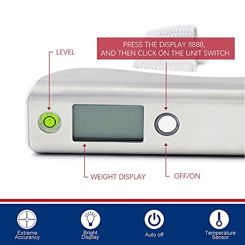 Studio : EPITEN Publisher : EPITEN Binding : Office Product Product Description Description: 50kg/110lb Digital Portable Travel Handheld Weighing Luggage Suitcase Bag Scale EPITEN portable luggage scales are extremely easy to use and hold when weighing your luggage, whether it be carry on bags or suitcases. Simply attach the included strap to the device and clip the strap around the handle of your bag and lift, it's that simple. The scales has an auto hold feature so within seconds you will know the weight of your bag. The scales will weigh up to 50kg/110LB accurately, the scales are also very lightweight, so you can easily take them with you on your travels weigh your bags before you return home and ultimately avoid any nasty excess baggage charges. Clear easy to read LCD Display. Easy to use - simple clip around the luggage handle and lift up for accurate measurement. Features: -Travel Scales with 50kg Capacity, Overload Indicator and LCD Display. -Equipped with High Precision Strain Gauge Sensor System. -Sleek design ideal for travel. -Features stylish stainless steel platform. -Easy-to-read LCD display. -User-friendly low battery and overload indicator. -High precision strain gauge sensor. -Design to fit your hand with comfortable touch. Specification: Maximum capacity: 50kg/110lb Minimum capacity: 50g/0.1lb Division: 50g/0.1lb Unit: kg/lb Power: 2 x AAA battery (included) Size:6.22 x 1.38 x 1.10 inches Weight 128g Package includeds: 1 x Handheld Digital Luggage Scale 2 x AAA Battery 1 x User Manual