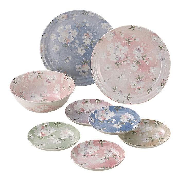 桜が可愛らしい色とりどりの大皿と取皿、大鉢のセットです。