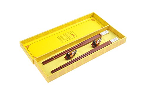 Elegant red sandalwood chopstick set, with metal chinese characters "HuaKaiFuGui" decoration (flowers bloom in prosperity), rests and decorative box (2 pairs), Mod. CB-S2-G-M01