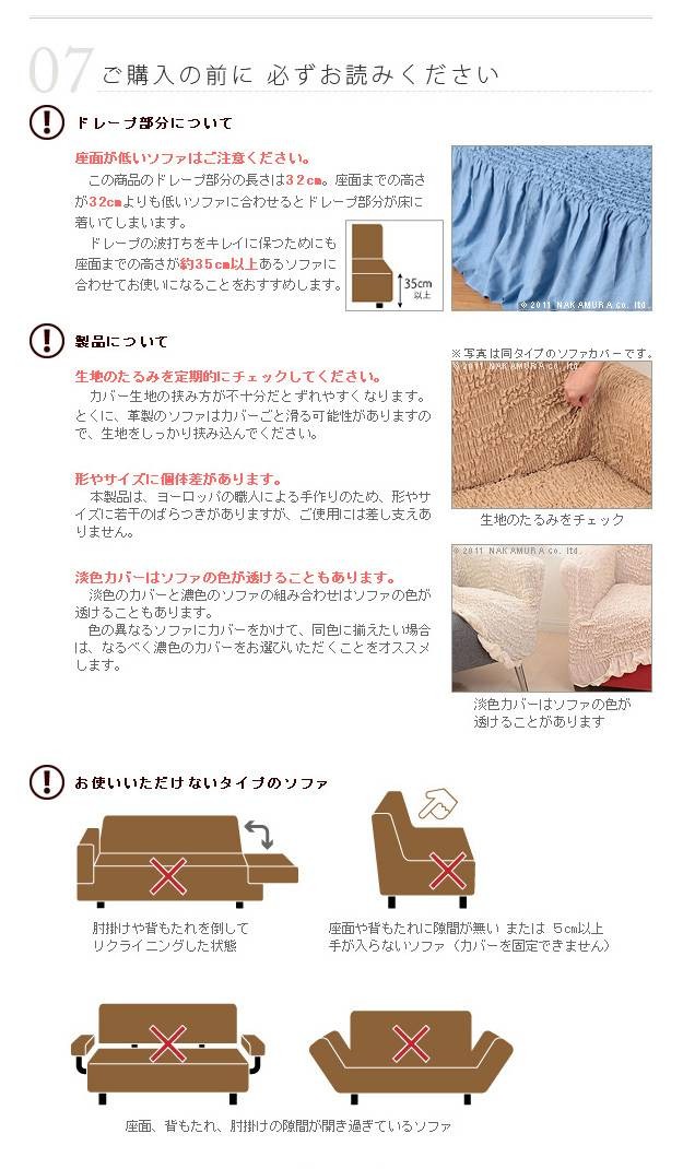 商品について:どんな形にも合わせやすいストレッチ素材のイタリア製ソファカバー。かぶせたら余った部分をソファのすき間に押し込むだけ。たっぷりとしたドレープと柔らかい凹凸が特徴。簡単模様替え♪洗濯OK