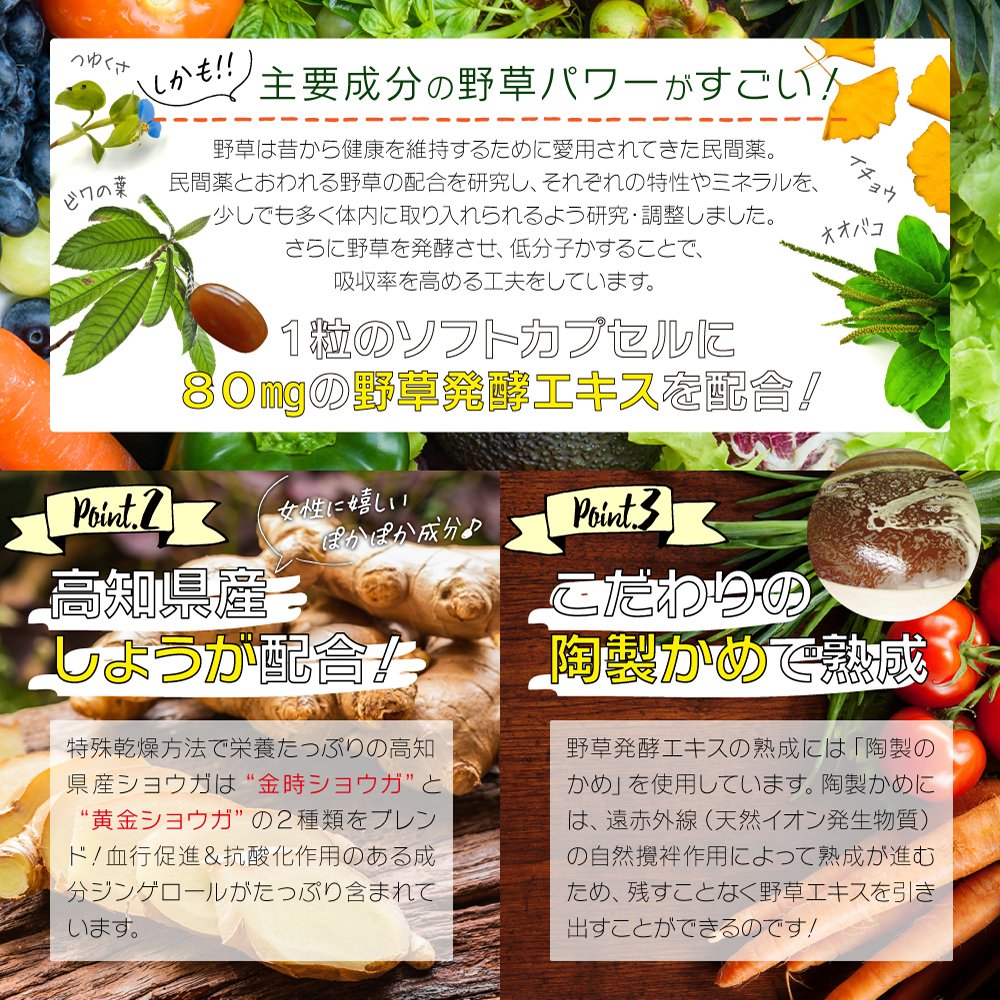 64種類の野草、9種類の野菜、10種類の果実、2種類の海草、5種類の糖類、そして高知県産ショウガを配合!