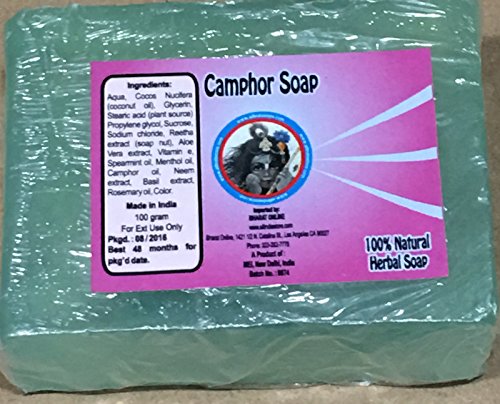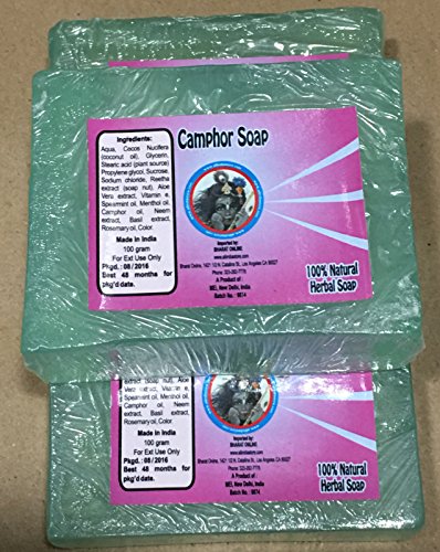 3 CAMPHOR SOAPS 100G (3.5 OZS) ea - bar size apr 2 -1/2 "x2"x 0.9" - Bharat online brand with Camphor and other nnatural ingredients