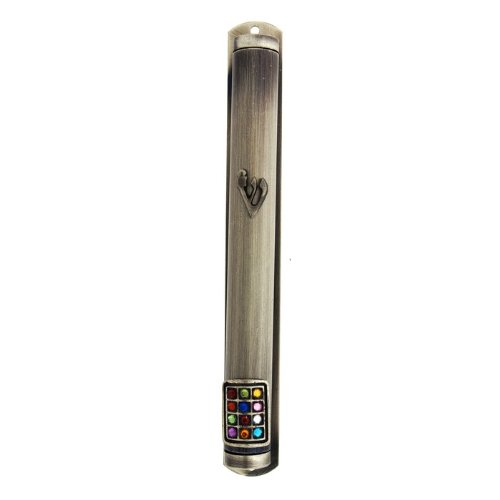 - This pewter Mezuzah Case has been decorated in the center with a Hebrew letter Shin and features a small replica of the Hoshen at the bottom with three rows of brightly colored stones.
