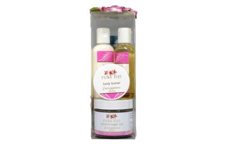 Includes a travel size Body Butter, Sugar Rub, Hydrating Body Lotion, and Exotic oil. These products were made from Fijian plant extracts and botanical ingredients. Using a soothing and calming effect, all four products are made to hydrate and condition you skin. The quality plant oils and extracts will leave your skin feeling smooth and rejuvenated.Feature