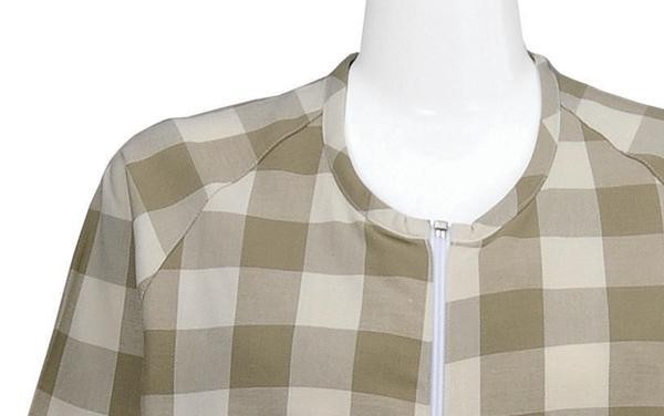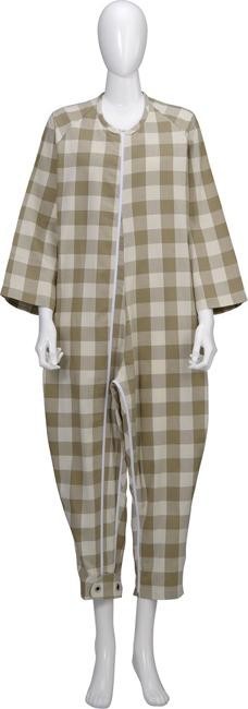 胸元にホックのないスマートなデザイン。右足首から胸元のファスナーと、股部分のファスナーで、着替えや介護が楽にできます。前身ごろ、股下がめくれます。 製造国:フィリピン 素材・材質:綿68%・ポリエステル32%