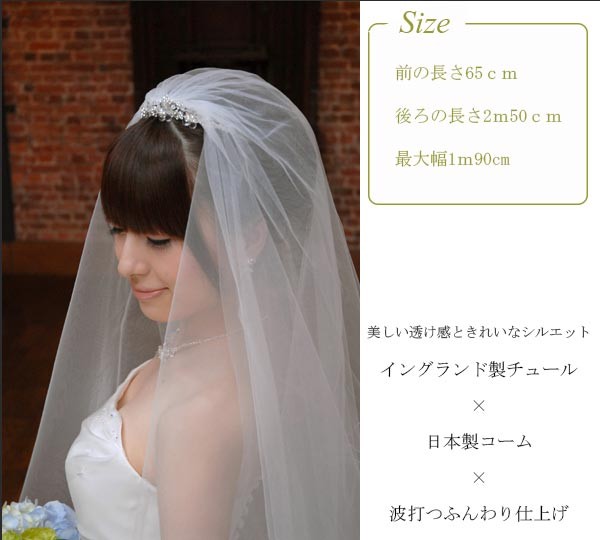 ⇒ 長さ3m・波打つふわふわベール [V55] ⇒ 同じ250cm・凛とした印象のパイピングベール [V51] ⇒ 同じ250cm・可憐なレースのやわらかベール [V61] |