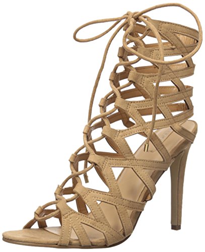 Gladiator-inspired heeled sandal with cagey upper featuring lace front with tie closure