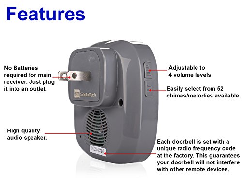 ✅ WANT TO LISTEN TO OUR CHIMES/RINGTONES BEFORE YOU BUY? GO AHEAD - Just SCROLL DOWN to the Technical Specs section below and click on the Specification Guide link to DOWNLOAD the PDF file. Open it with Adobe Acrobat Reader to play all 52 ringtones. WeÍre proud to announce weÍve developed a custom music chip in our doorbells that includes carefully selected. Over 50+ different ringtones. Operating range of over 500 ft (1000 ft in open area). 4 levels of adjustable volume from 25db - 110db.