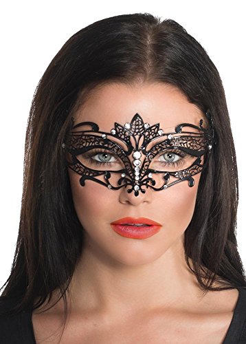 -. Brand : Elevate Costumes -. ClothingSize : One Size -. Color : Black -. Department : womens -. EAN : 0616983173275 -. Feature : Black metal masquerade mask in a delicate laser cut design with silver crystals all over. / Can be gently bent to suit the shape of your face. / Secures with black ribbons on either side of the face. / Mask is 2 3/4" high and 7" wide. -. Label : Elevate -. Manufacturer : Elevate -. ProductGroup : Apparel -. ProductTypeName : APPAREL -. Publisher : Elevate -. Size : One Size -. Studio : Elevate -. Title : Shiny Black Metal Masquerade Mask with Rhinestones by Elevate Costumes -. UPC : 616983173275