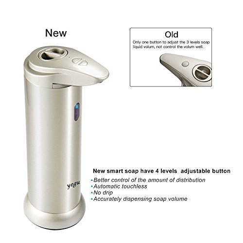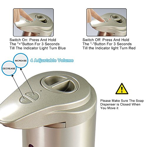 - UPGRADED ADJUSTABLE SOAP LIQUID VOLUME: There are 4 levels of soap liquid volume which press "+" or "-" botton once for a level. You can change how much of the soap comes out. No dripping or trailing, doesn't waste soap. Also press this botton to switch ON/OFF, more convenience.