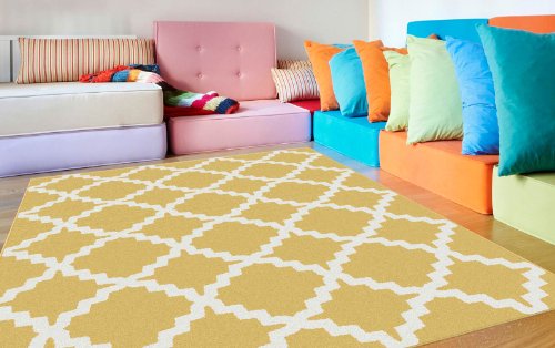 This contemporary home decor accent frieze rug features exotic and delightful Moroccan-influenced lattice design on relevant colors. Offers versatility for an interesting addition to either traditional or contemporary home décor. Mellow yellow. Well-crafted with a 0.39-inch pile height, this high-quality rug also offers comfort and durability. Plush feel, high density polypropylene fibers made with quality construction to ensure long wear. Spot clean.Feature
