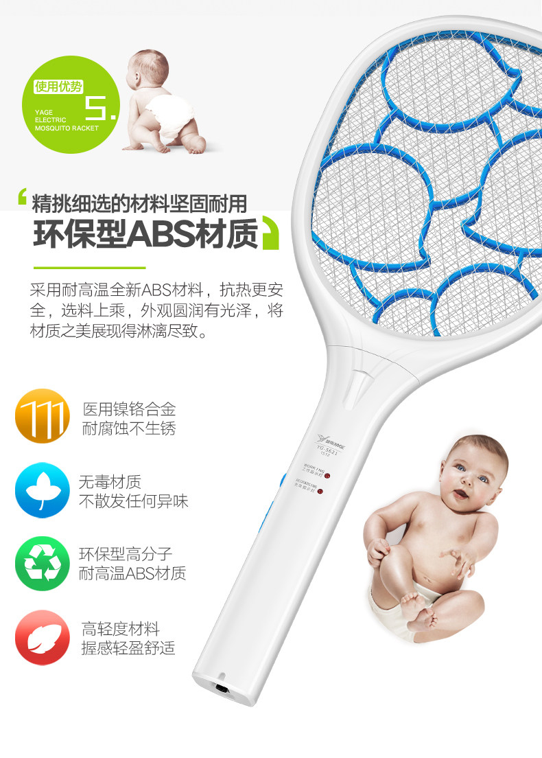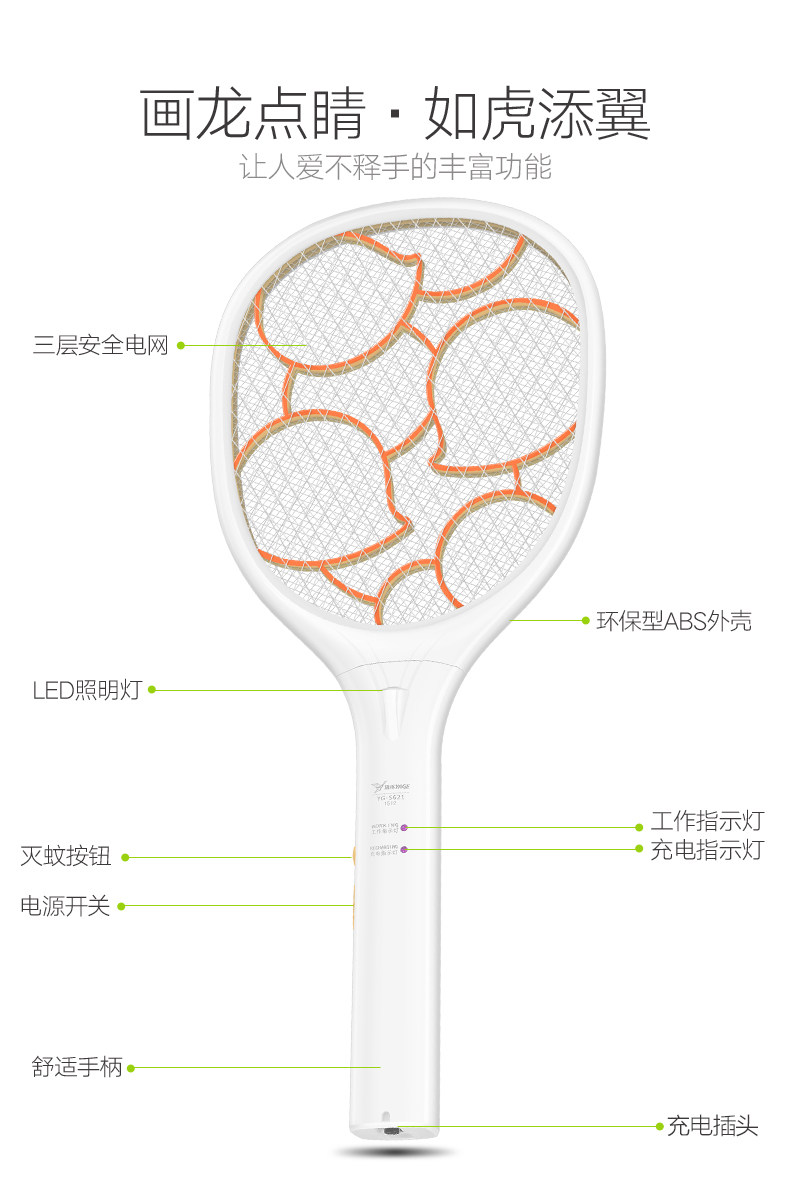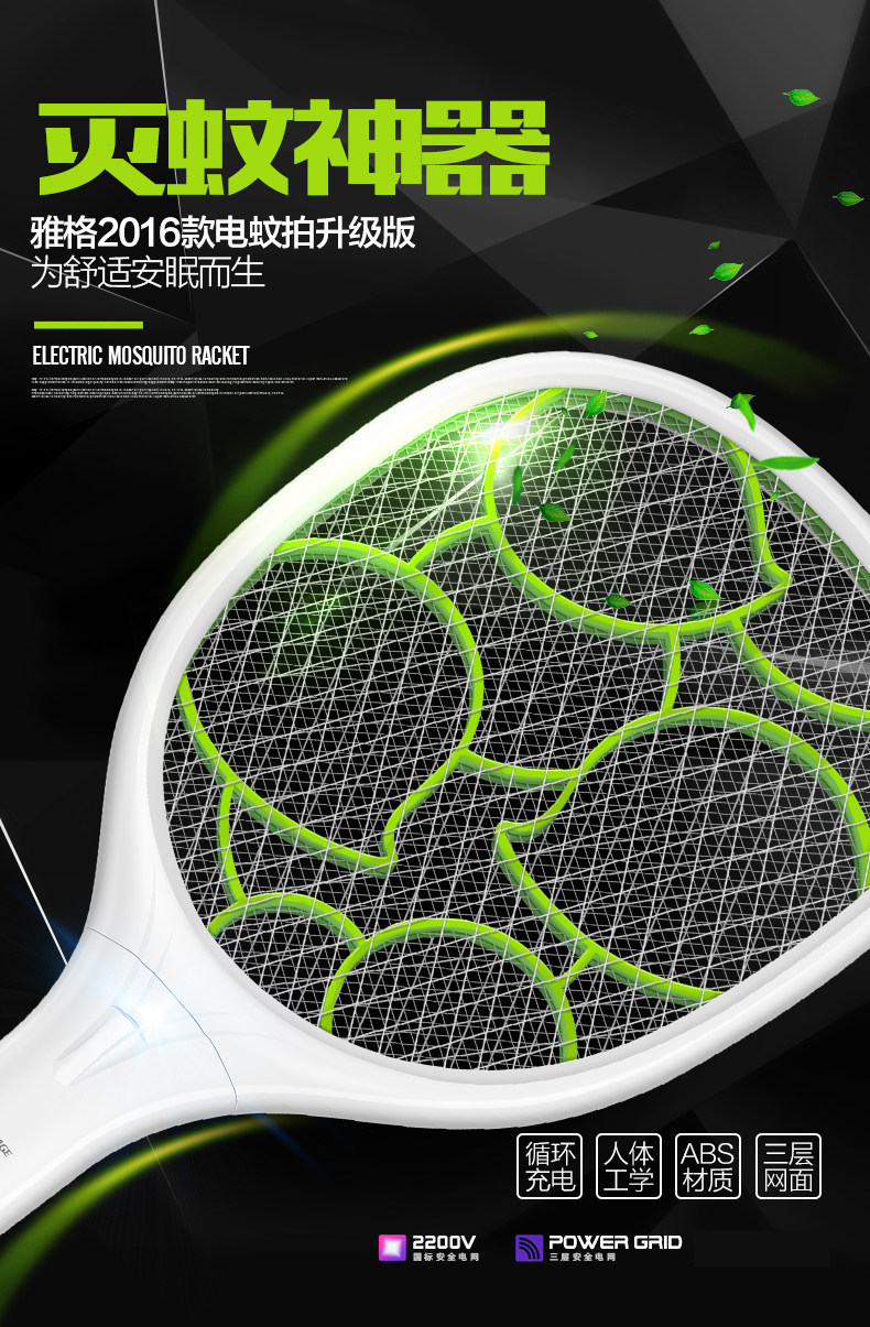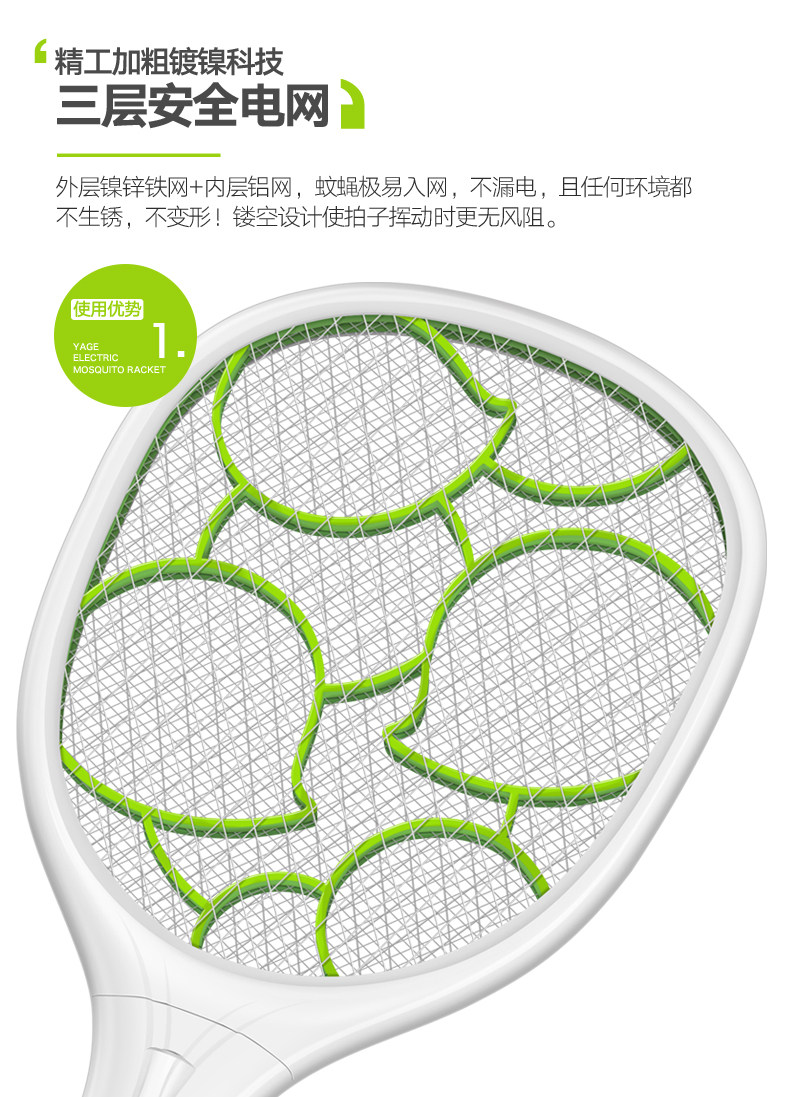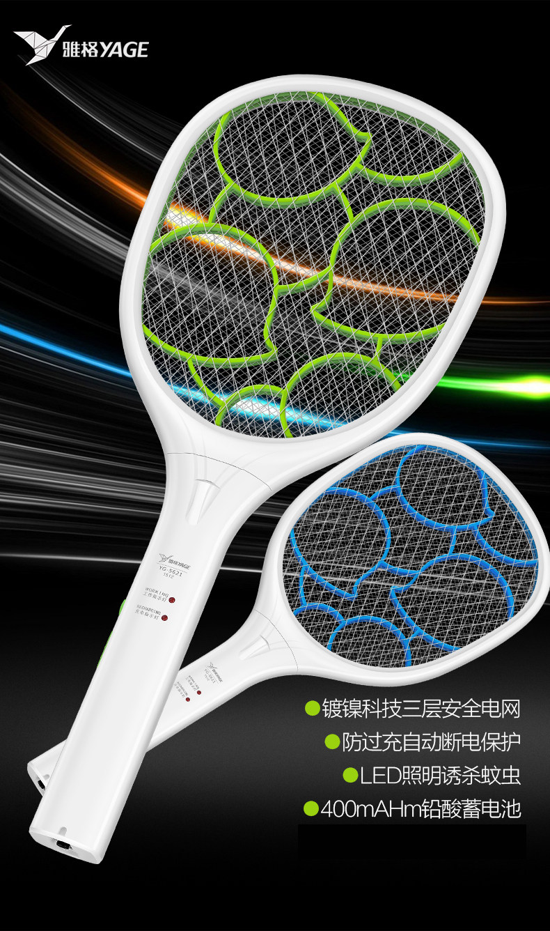 雅格电蚊拍充电式大号网面led灯多功能电灭蚊器蚊子拍电苍蝇拍