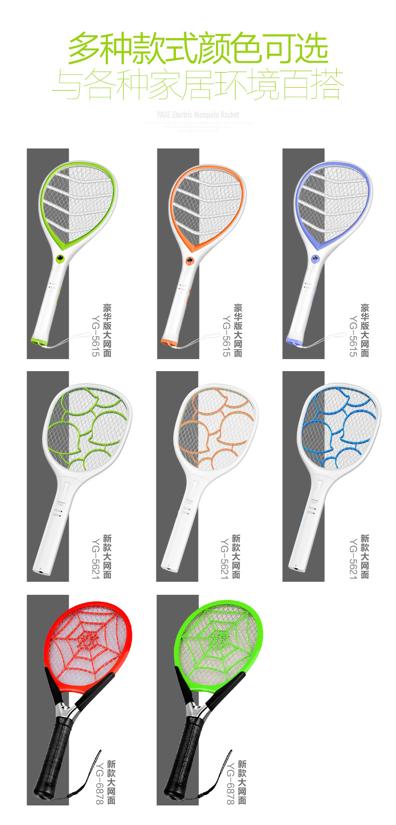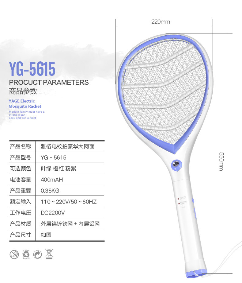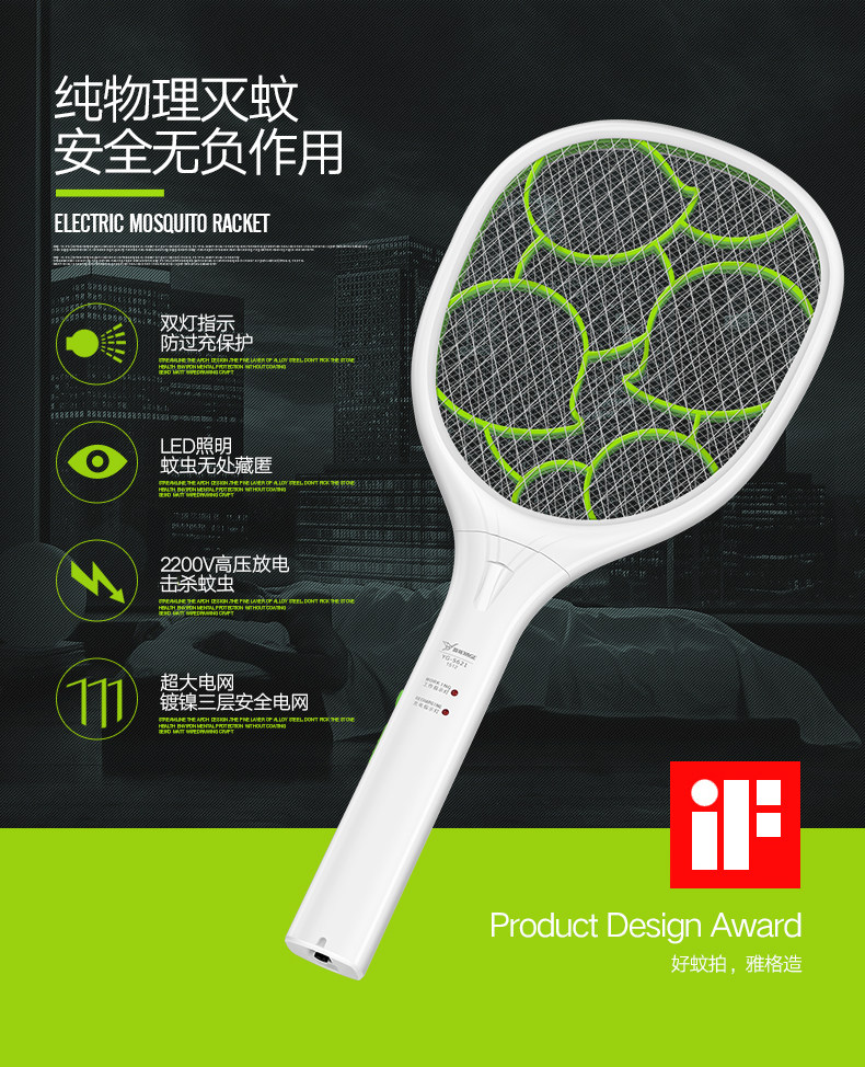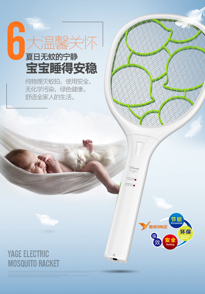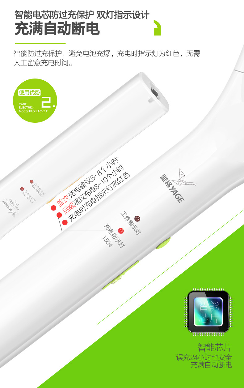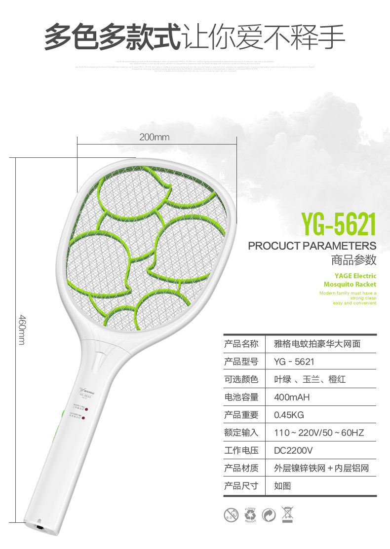 雅格电蚊拍充电式大号网面led灯多功能电灭蚊器蚊子拍电苍蝇拍