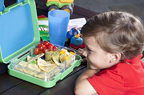 It has 4 practical compartments portioned for a child's appetite. One compartment holds a full size sandwich or entrée of your choice, two compartments for sides such as fruits or vegetables and another for dip.