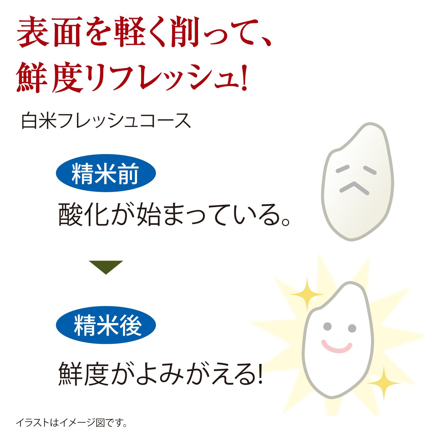 Even with commercially available white rice, by cutting lightly on the surface of rice, fatty acids are dropped and freshness revives.