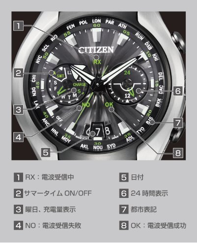 인공위성에서 시각 정보를 수신 하는 satelite 시스템을 탑재한 에코 드라이브 손목시계,대망의 신모델이 등장.한층 기술 진화와「날개」야「하늘」부터 힌트를 얻었 아름답다디자인.①세계 최고 속도의 최단4초의 수신 시간(신시스템을 개발) ②세계 최초의 풀 메탈화로 성공 「넓은 하늘이나 바람,그리고 날개」가 테마.넓은 하늘을 추는 비행기부터 인스피레이션(영감).◆중공 형상의 케이스 싸이드 날개부터 인스피레이션(영감)를 얻은 유선형의디자인.티타늄 소재의 특성을 살리면서(도),약동감과 가벼움을 표현.◆3 층구조의 입체적인 문자판 제트 엔진의 터빈을 모티브.3층으로 이루어지는 투명한 문자판을 채용하고, 부유감을 표현./20기압 방수 / 정밀도:평균 월 차이±15초(비수신 시) / 위성 전파 수신 기능 / 수신ON/OFF기능 / 광발전:풀 충전 시 약2년 가동 / 월드 타임(세계26도시) / 퍼펙츄얼캘린더 / 날짜/요일 표시 / 24시간계 / 파 회《구스》(JIS1종내 자성능 / 충격 검지 기능 / 침자동 보정 기능) / 야광(바늘+인덱스) / 데《라테쿠토》DLC / 원산국:일본