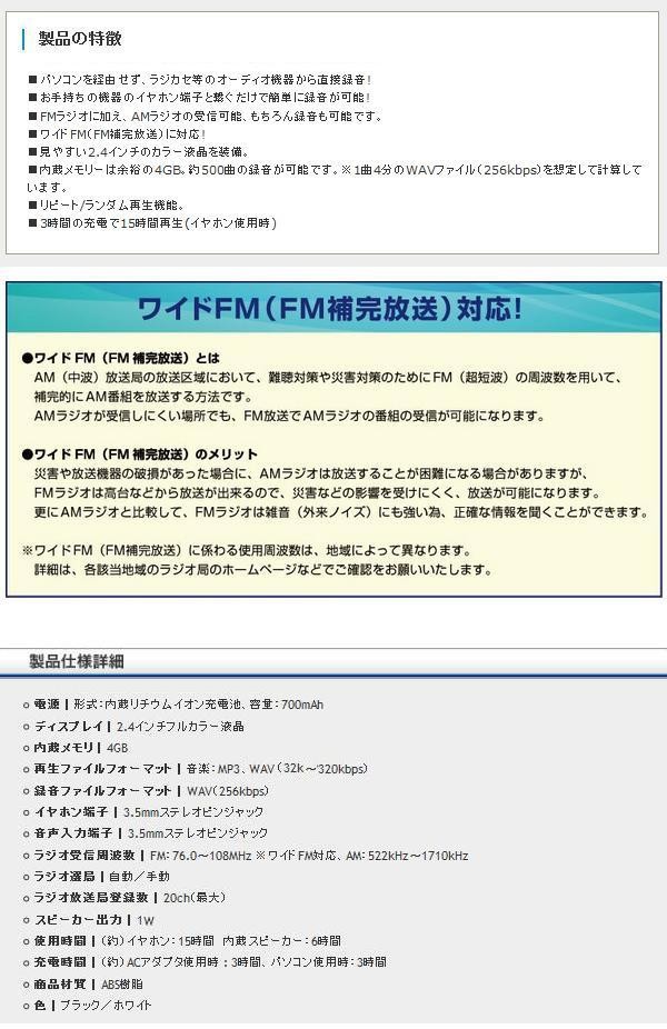 | お手持ちのオーディオ機器のイヤホン端子と繋ぐだけで、お好きな音楽を簡単に録音&持ち運ぶことができます♪FMラジオに加え、AMラジオの受信も可能。電源はリチウムイオン充電池を内蔵(ご使用になる前に必ず3時間以上充電をしてください)。再生時間はイヤホン使用時15時間、スピーカー使用時6時間です。 |