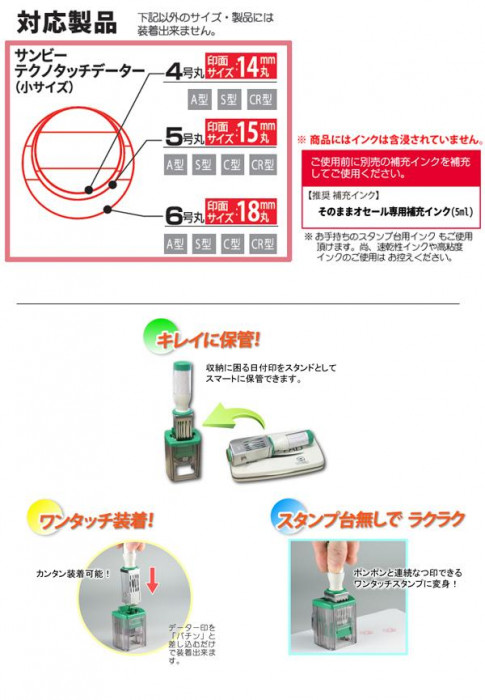 fk094igrjsテクノタッチデーター印(小サイズ)をスマートに収納!スタンプ台なしで連続捺印が可能なワンタッチスタンプになりますサイズW41×D36×H57mm(データー印装着時:W41×D36×H134mm)個装サイズ:5×4×7cm重量25g個装重量:59g製造国日本テクノタッチデーター専用アタッチメント※データ印本体・インクは付属しておりませんテクノタッチデーター印(小サイズ)をスマートに収納!スタンプ台なしで連続捺印が可能なワンタッチスタンプになります