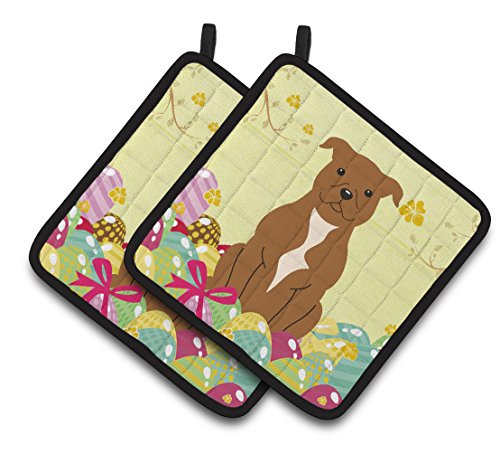 Caroline's Treasures BB6047PTHD Easter Staffie Bull Terrier Pair of Pot Holders, 7.5" x 7.5", Multicolor