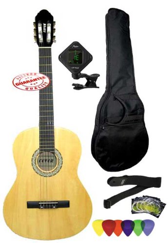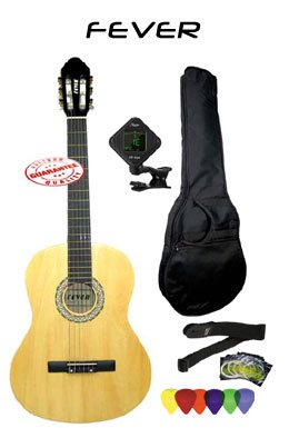 Studio : Fever Publisher : Fever Product Description This Full Size Student Beginner Nylon Classical Fever Guitar package provides quality and craftsmanship at affordable price. This Guitar delivers excellent tonal balance and thinner necks for extended comfort and playability. Classical body providing easier access to the frets for an extended tonal range. This Guitar is designed specifically to get beginning musicians started out on the right fret. A great guitar for students learning the ins and outs of classical guitar technique without breaking the bank. The package comes with guitar gig bag Chromatic tuner Extra set of strings Guitar strap and 5 picks. 0