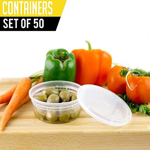 8 oz Deli and Slime Cups By Chefible: 50 Pack Of Reusable Food Containers With Airtight and Leak Proof Flat Lids – Clear BPA Free, Microwave And Dishwasher Safe Storage Cups For The Freezer