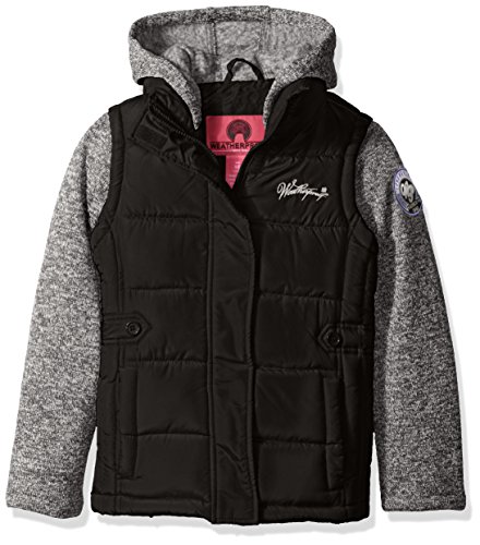 Weatherproof Big Girls' Bubble Jacket with Sweater Fleece Sleeves, Black Bubble/Grey Sleeves a, 7/8