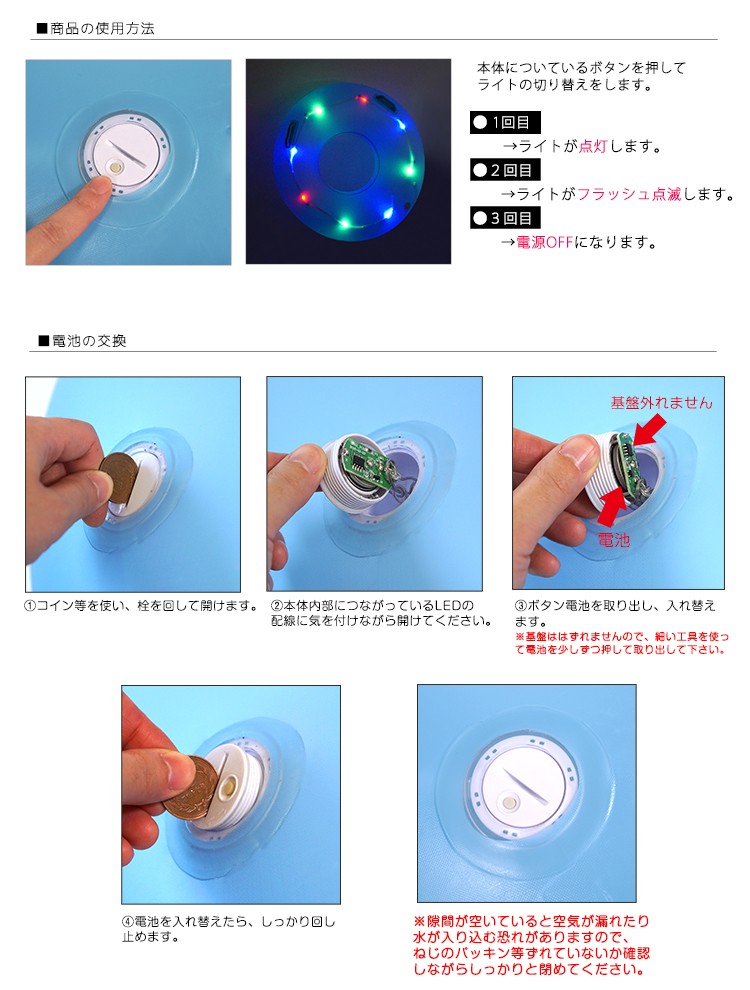 ▼モニターによって実際の色とは異なる場合がございます。イメージ違いなどお客様都合によるご注文後のキャンセル、返品はお受け致しかねます。 ▼ベンジン、シンナー等の揮発性用材は使用しないでください。 ▼プールや海水浴場では、監視員の指示に従いご利用ください。 ▼本商品は救命具ではありません。溺水に対する保護機能はありません。 ▼万が一当商品をご利用の際に事故等が発生した場合、当店では一切の責任を負いません。 ▼ 内蔵の電池は検品用の為、すぐに切れてしまう 場合がございます。 到着時には止まってしまっている可能性もございます。 その際はお客様で電池を購入していただき、電池交換を行ってください。 商品到着時に電池が止まっているという内容での返品・交換は承りかねます。 |