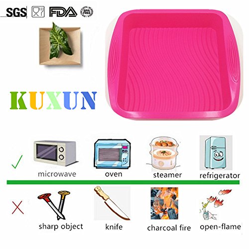 Cake Pan | Non-Stick Silicone 8-Inch Square Baking Pan by KuXun | Durable, Convenient, Eco-Friendly No-Stick Baking Mold Cookware | Brownie Pan 8” x 2”, Pink Silicone Handles, Beautiful Wavy Line