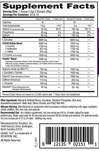 QUAKE 10.0 is packed with a 2:1:1 ratio of XTEND BCAAs, which helps burn fat and preserve muscle mass. Added PeakO2 helps boost power output and increase time-to-exhaustion.