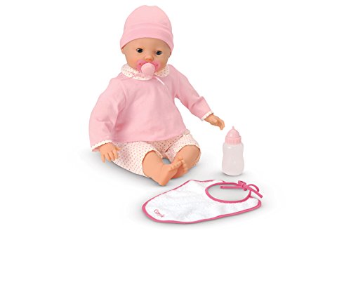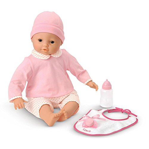 She's going to instantly fall in love with her Corolle Mon Bebe Classique Lila Cherie 17 in. Doll. This sweet-faced baby doll comes dressed up cozy in a pink pajama top, pink and white striped bottoms, and a white cap. She comes complete with a terry cloth bib, pink pacifier, and bottle. This baby doll was designed for kids three and older. She has a huggable soft body and smooth vinyl skin gently scented with vanilla. This Mon Bebe Classique dolly can giggle, babble, cry, suck on her bottle and pacifier, and her cheeks even blush. She's just like a real baby!Feature