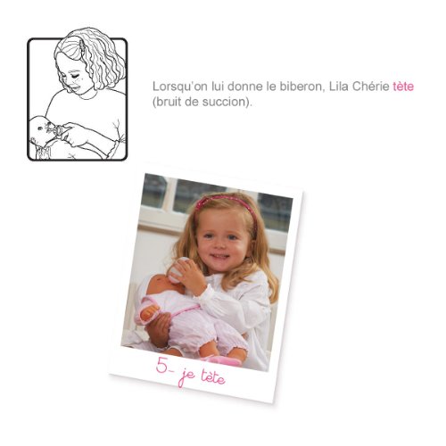 Lila is a soft-bodied doll with five baby-like features: When you press her left hand (decorated with pink hearts), she coos and babbles