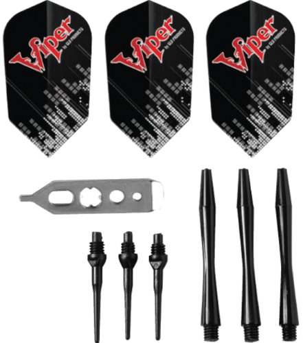 Set includes three complete darts plus extra set of flights, nylon shafts, tips, and dart wrench