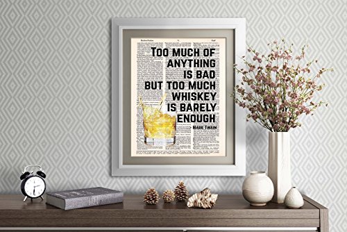 Whiskey lovers will love this image of a glass of whiskey being poured next to a quote by American author Mark Twain. "Too much of anything is bad, but too much whiskey is barely enough." Great for a man cave or a bar. It also makes a great gift for dad. It is printed on a real dictionary page, ready for you to frame.