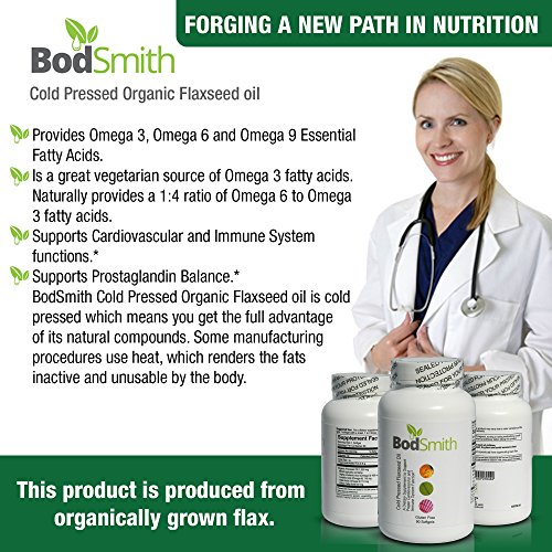 -. Binding : Health and Beauty -. Brand : BodSmith -. EAN : 8507520070442 -. Feature : • BodSmith Flax Seed Oil is cold pressed which means you get the full advantage of its natural compounds. Some manufacturing procedures use heat, which renders the fats inactive and unusable by the body / BodSmith Flax Seed Oil is produced from organically grown flax / Provides Omega 3, Omega 6 and Omega 9 Essential Fatty Acids. Is a great vegetarian source of Omega 3 fatty acids / Naturally provides a 1:4 ratio of Omega 6 to Omega 3 fatty acids. • Supports Cardiovascular and Immune System functions.* • Supports Prostaglandin Balance.* -. IsAdultProduct : 0 -. Label : BodSmith -. Manufacturer : BodSmith -. MPN : 29791600 -. PackageQuantity : 1 -. PartNumber : 29791600 -. ProductGroup : Health and Beauty -. ProductTypeName : HEALTH_PERSONAL_CARE -. Publisher : BodSmith -. Studio : BodSmith -. Title : BodSmith Organic Flaxseed Oil Cold Pressed Non-GMO 90 Liquid Softgels