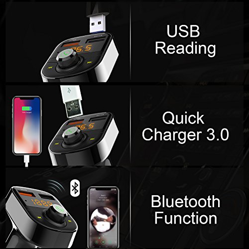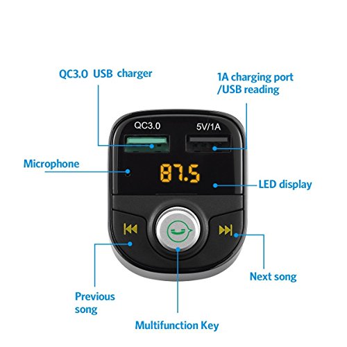 2.Frequency Connect: The device FM frequency is 87.5-108MHz.Please turn car radio channels to one of Frequency 87.5-108.0Mhz.Then plug the device, make sure the car charger keeps the same frequency to the car radio channels: 1.Choose an blank and clear channel in the car audio. 2.Long press the FM transmitter answer key until the LED display flashing. 3.Turning the answer knob adjust the same channel at FM transmitter. 4.Short press the answer key to fix the channel. 5.Connect phone bluetooth or insert the USB/TF card, FM Transmitter will start to play. Please repeat above steps if has noise interference in the radio.