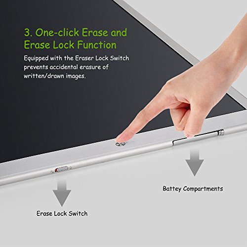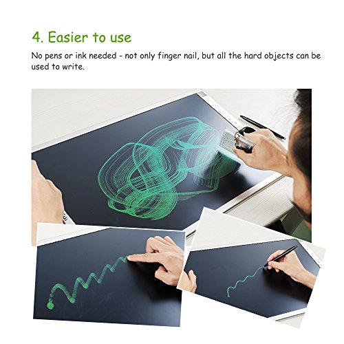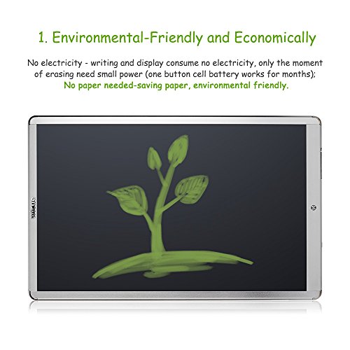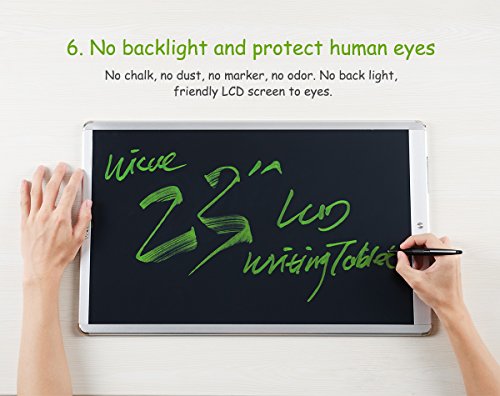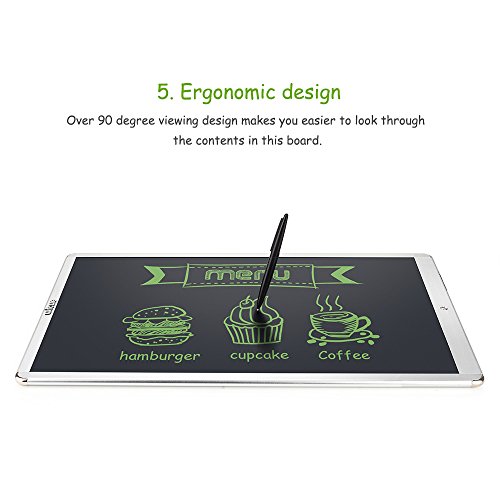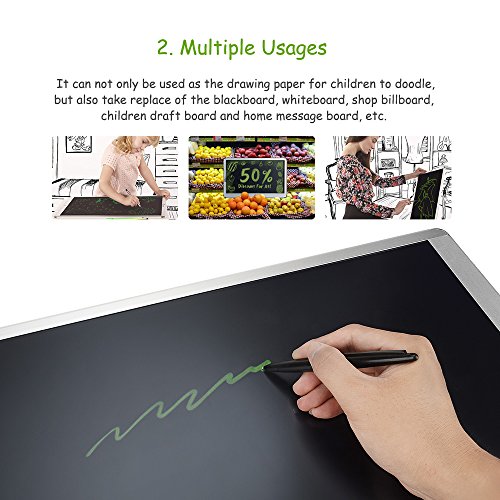 -. Feature : 1. Dimension: 23 inches (515*321*8.8 mm/ 20.3*12.6*0.4 inches) ,Viewing angle: over 90 degree. / 2. Environmental-Friendly and Economically.No electricity needed,No paper needed,saving paper. / 3. Multiple Usages. Fits for Restaurant Menu Boards, Daily Specials, Promotions, Special Events, Discount Sales, New Item Releases or P.R.Ice Lists, drawing paper,blackboard,whiteboard,shop billboard,children draft board and home message board, etc. / 4. Equipped with the Eraser Lock Switch prevents accidental erasure of written/drawn images. / 5. No chalk, no dust, no marker, no odor. No back light, friendly LCD screen to eyes.