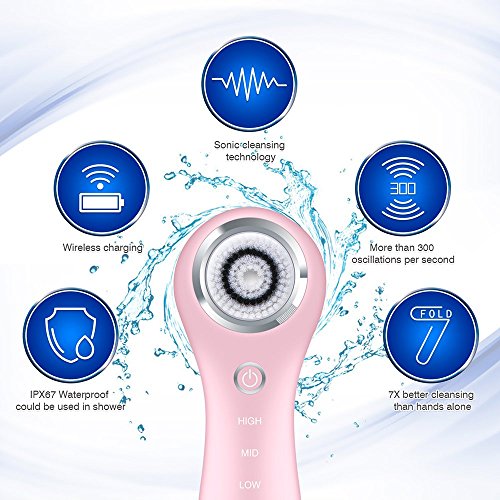 -. Feature : 【Advanced Sonic Cleansing Technology】Hangsun SC200 facial brush uses a sonic frequency of more than 300 oscillations per second to deeply cleanse your skin far more effectively, yet more gently, than traditional superficial cleansing or simple rotating brushes. It is 7X better cleansing effect than hands alone. Your skin will be smoother, softer and more radiant. / 【Effective】The Hangsun SC200 sonic cleansing brush is 7X more effective at removing make up than hands alone. Skin care products such as skin creams, serum, cleanser and moisturizers will absorb better. It's great for all skin types and many skin conditions from dry aging skin to oily skin. It helps to remove your impurities and acne, clear pores and exfoliating tough skin etc. / 【3 Brush Heads】Comes with 3 smart brush heads to meet your different needs. Normal brush head for normal, combination or oily skin; Sensitive brush head is specially designed for the sensitive skin; Body brush head can gently remove your dead skin cells with exfoliating effect. Thoese brushes are safe and gentle, and suitable for all skin types include sensitive skin. / 【2 Automatic Working Modes】The Hangsun Sc200 face brush have 2 automatic working modes(30 seconds and 60 seconds quick cleansing mode)and 3 adjustable speeds(Speed LOW is gentle, suitable for compromised or fragile skin, even very sensitive skin conditions; Speed MID is developed for normal daily use, suitable for all skin types; Speed HIGH is developed for deep cleansing, suitable for a comfortable and more intensive cleansing.), very easy to operate. / 【IPX7 Waterproof level】You can use it freely while taking a shower. It is also rechargeable and portable, with wireless charging holder, you can use it safely and conveniently.