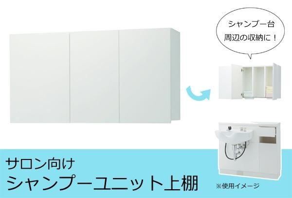 | サロンのシャンプー台周りの収納に☆タオル収納スペースが3ヶ所あり、シャンプータオルの他にヘアダイタオルも収納OKな上棚です。タオル収納部は下からタオルを引き出せる構造です。 |
