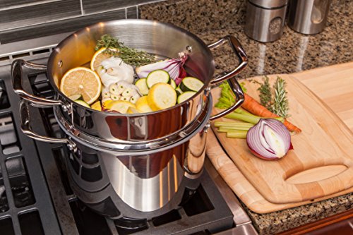 This stainless steel 18/10 tri-ply clad stockpot with stainless steel steamer insert ensures even heat distribution for an excellent cooking experience. It is compatible with electric, gas and induction cooktops. The domed, tempered glass lid helps keep steam in to make foods moist and flavorful, while allowing you to monitor your food. The double-layer ceramic coating provides easy cleanup and excellent food release. Perfect for vegetables, pasta and more. The stainless steel body is oven safe to 420°F, and the tempered glass lid is oven safe to 350°F. The stockpot is dishwasher-friendly, but handwashing is recommended.Feature