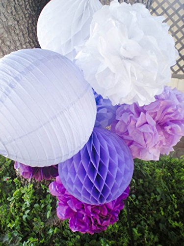 - Package included: Total 8pcs. 1pc 20cm white paper lantern,1pc 25cm white pom poms flower,2pcs 20cm pom poms flowers(lilac,lavender),2pcs 20cm grape purple pom poms flowers,2pcs 15cm paper honeycomb balls(white,lavender)