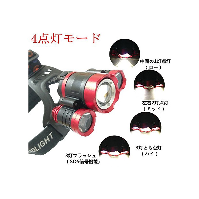 【4개의 점등 모드】4점등 모드 조절 가능한 방수LED헤드라이트①중간의 라이트 점등②좌우2곳의 라이트 점등③3개의 라이트와도(모두) 점등④3 등플래쉬(SOS신호 기능,야외,재해 시 대활약).