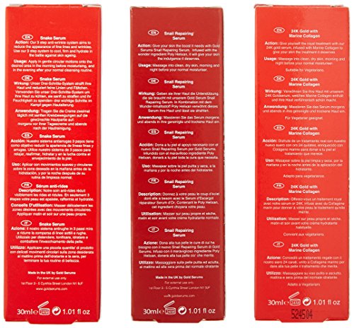-. Feature : 24k with Marine Collagen Serum is a revolutionary combination of real 24 carat gold and marine collagen / The use of 24 carat gold in skincare dates back to the time of Cleopatra, and helps to leave the skin with an instantly more radiant. / Gold Snake Serum is enriched with Syn-Ake, the award winning active ingredient which aims to reduce fine lines and wrinkles / It freezes, firms, hydrates / Snail Repairing Serum is infused with the wonder ingredient Poly Helixan, which has been hailed for its protective and nourishing properties
