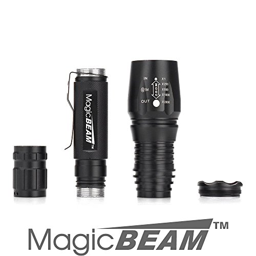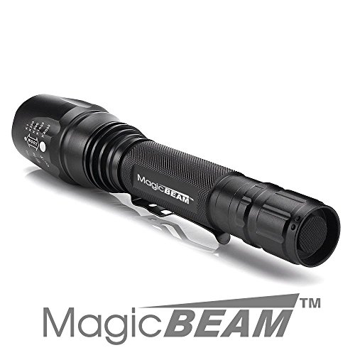 Magic BEAM CREE XML-T6 1,200 Lumens Water Resistant LED Tactical Flashlight with Rechargeable Li-Ion Batteries, Charger, Adjustable Zoom Focus, 5 User Modes, and Holster