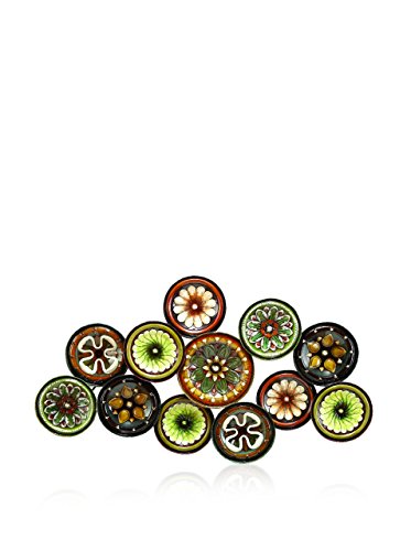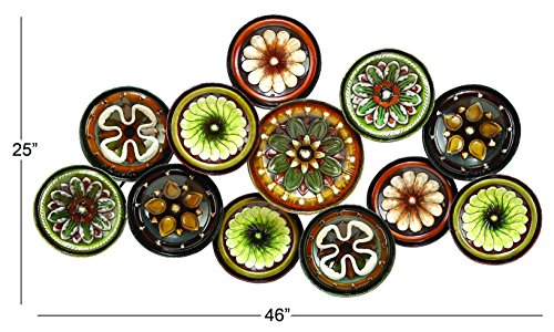 46 inch updated traditional brown, green and multi hued iron layered flower Petal design assorted disc montage wall sculpture. This product is manufactured in China.