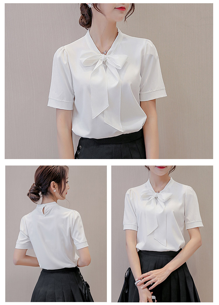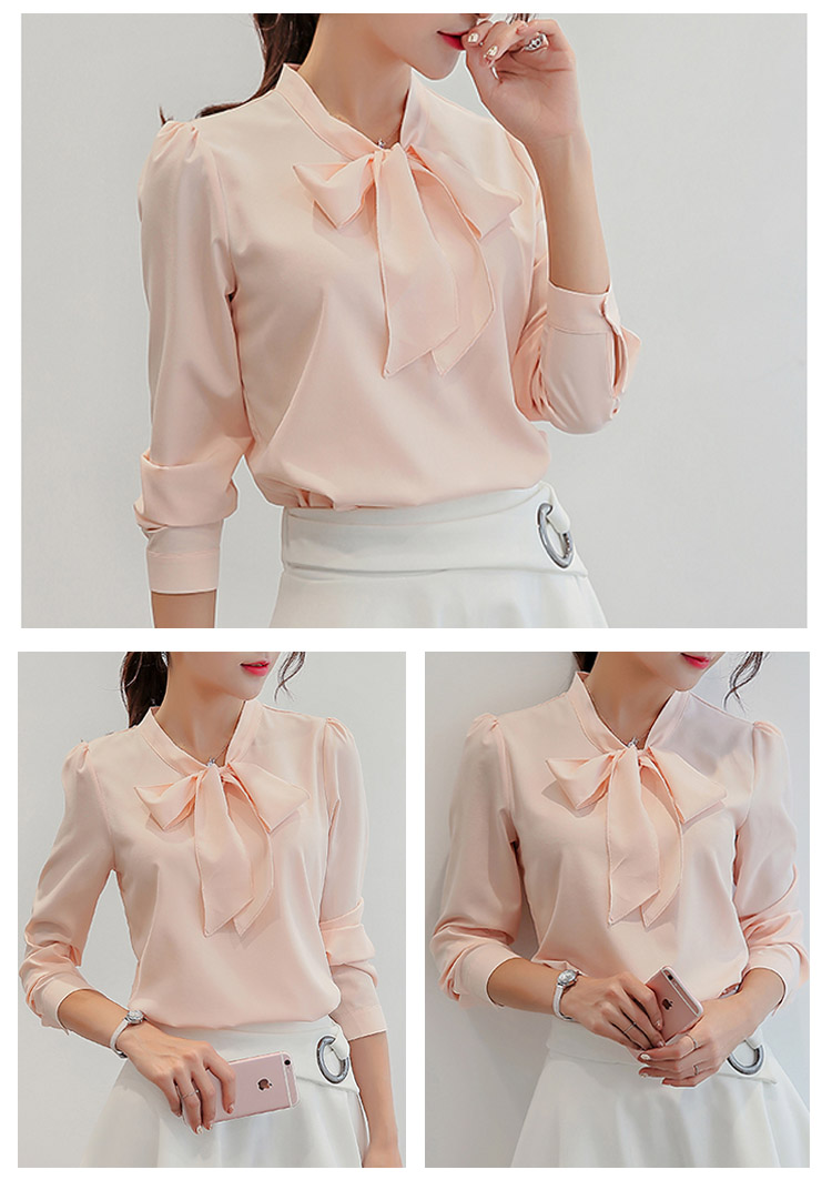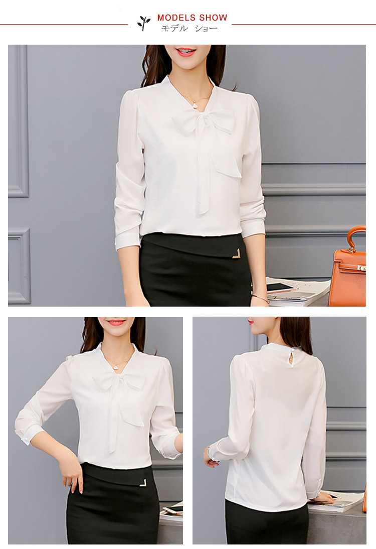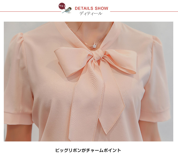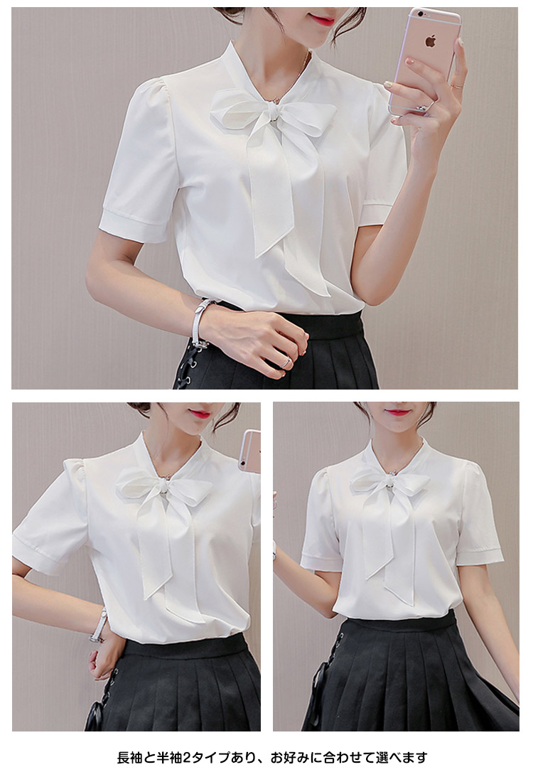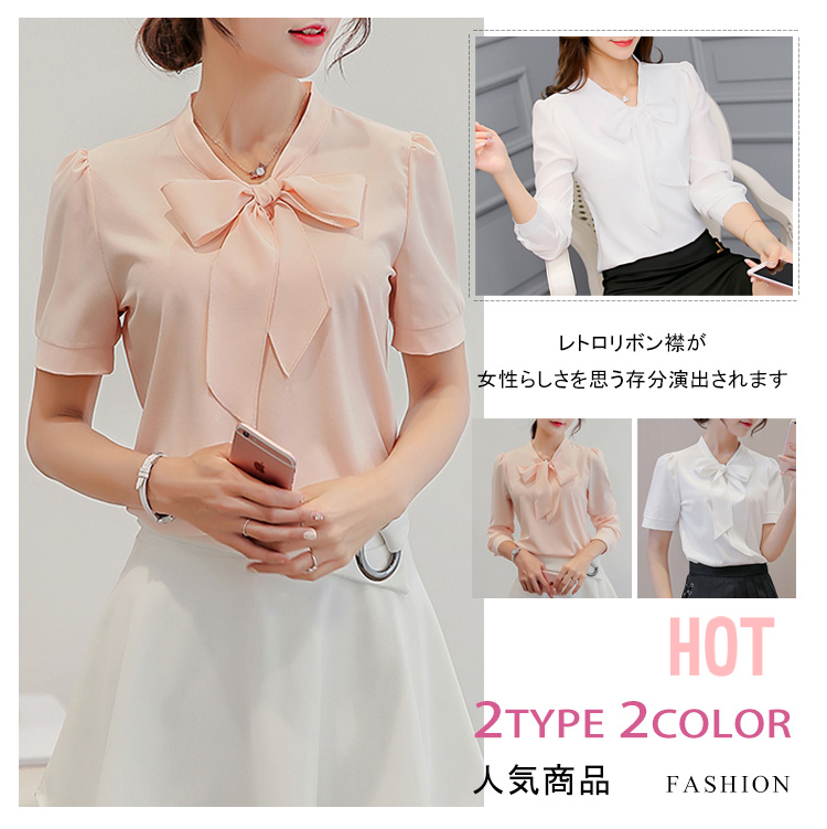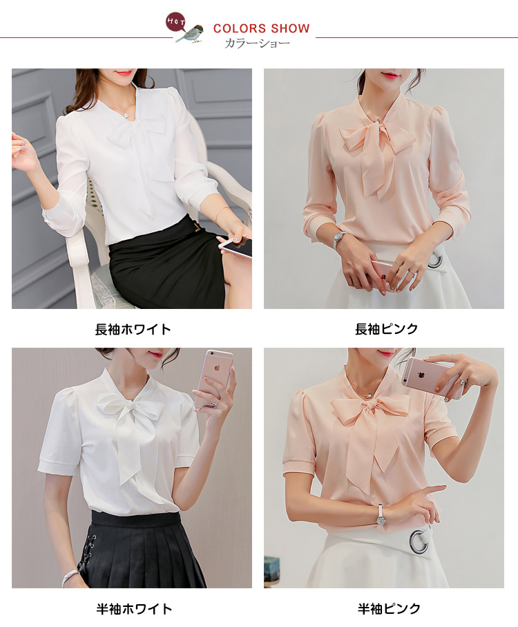 | レトロリボン襟が女性らしさを思う存分演出されますシンプルなデザインがどんなシーンにも使えるから、OLには最適長袖と半袖2タイプあり、お好みに合わせて選べますボトムスのinにして、OUTにしてもきれいにメイク◎ | |