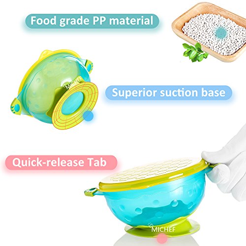 ❤Stronger Suction, Less Mess: MiChef's suction base are made of high quality TPE which improve a stronger adhesive force on the highchair, save more food even will not fall to the floor. Easy release adult tab means adults can remove it in seconds, toddlers can't!!