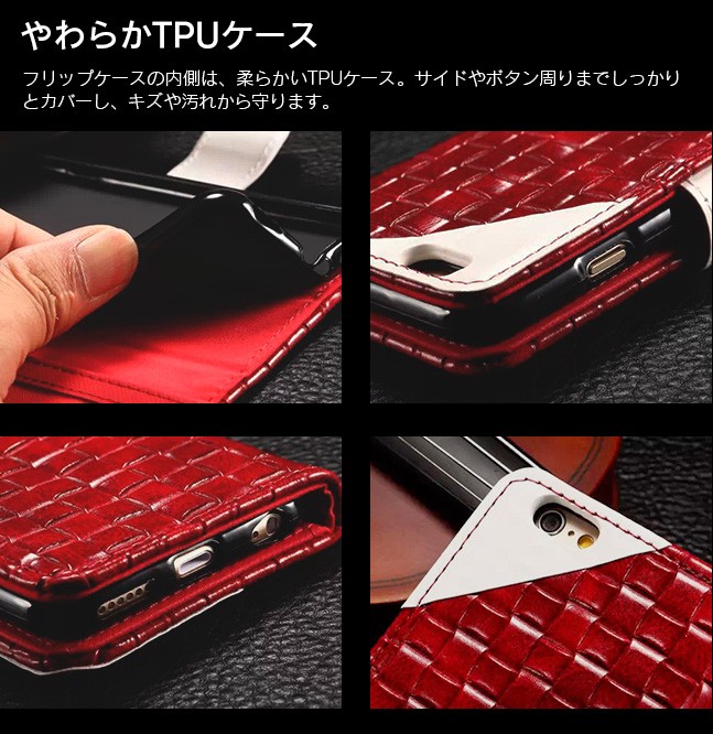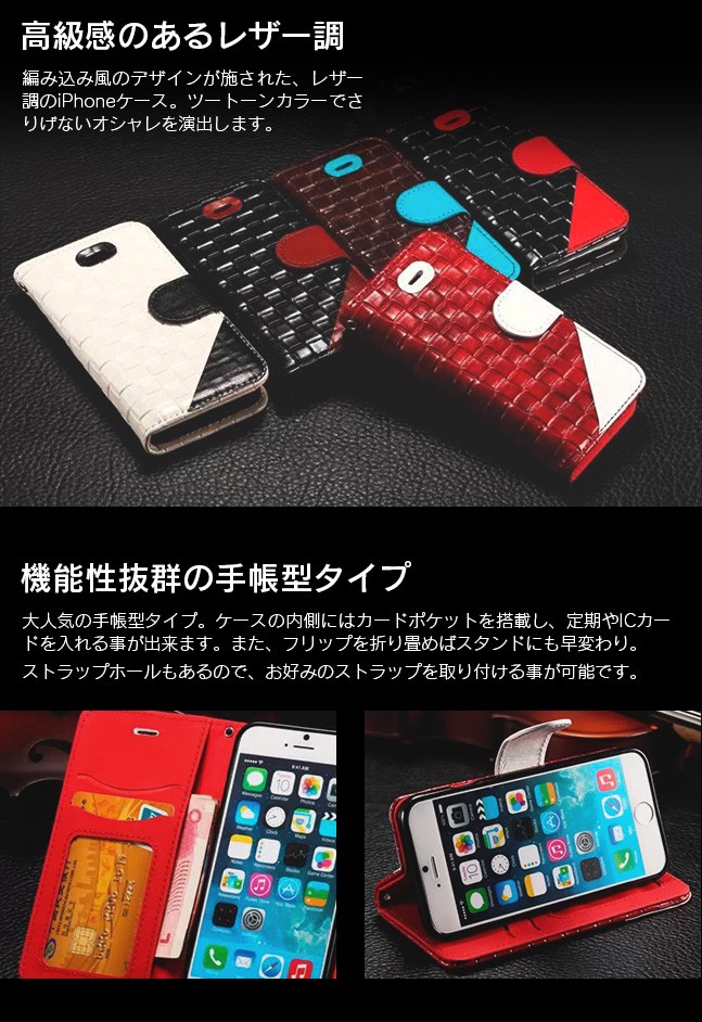 編込み風のデザインが施されたレザー調のiPhoneケース。ツートーンカラーでさりげないオシャレを演出します。もちろん、ケースを装着したままカメラ撮影やボタン操作、ケーブル接続が可能です。また、ケースの内側にはカードポケットを搭載しICカードや定期券などが入れられます。