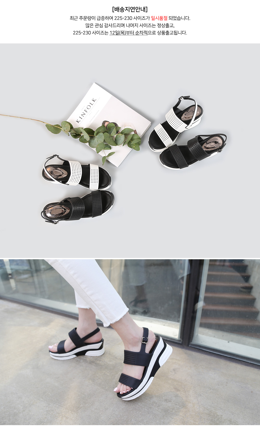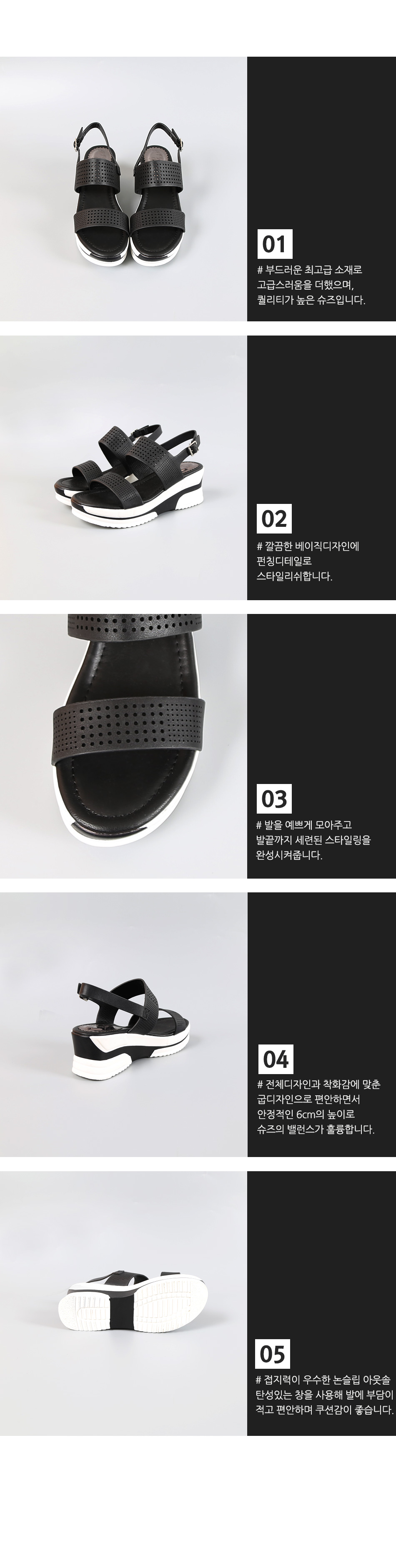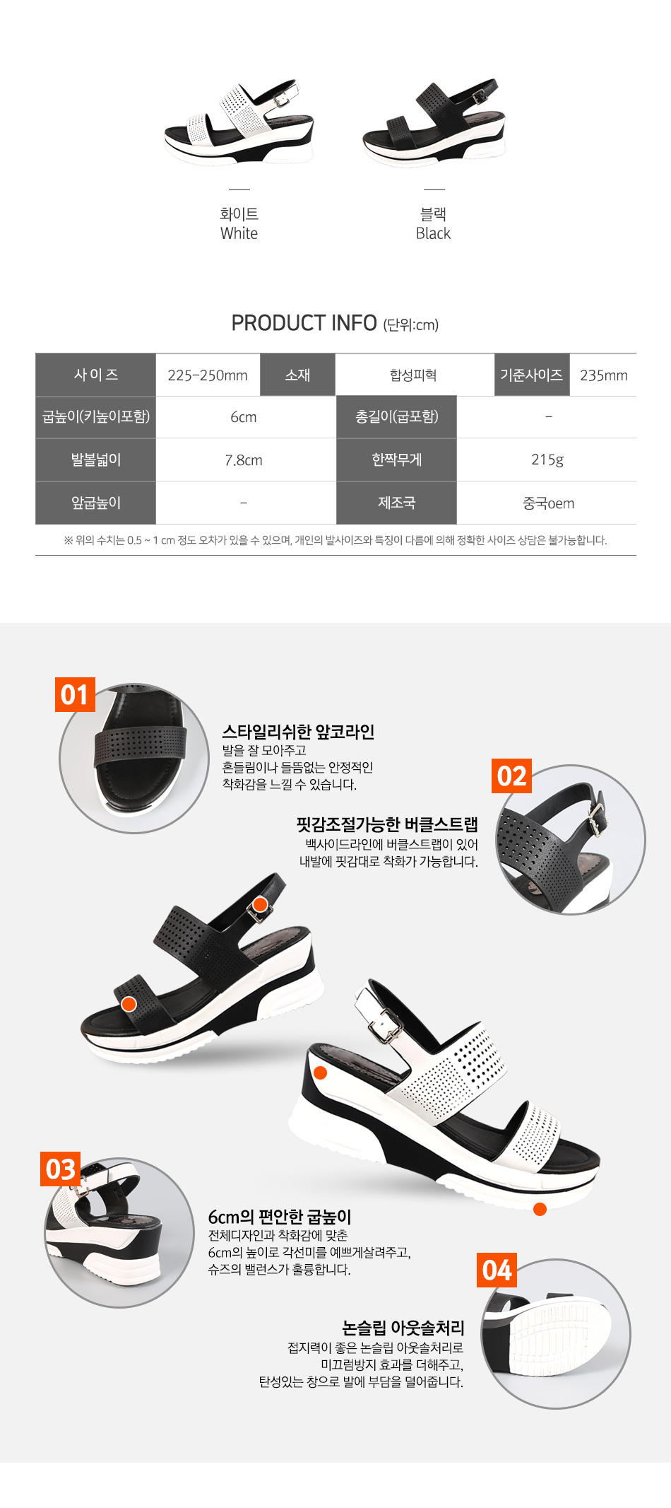 PR-LD412. 레일슨[MD COMMENT]캐쥬얼한 무드로 즐겨신기 좋은 샌들 소개합니다.요녀석은 군더더기없이 깔끔한 디자인이지만스트랩에 펀칭디테일로 스타일리쉬함이 물씬 느껴지는 슈즈인데요~도톰한 6cm의 굽높이로 자연스러운 키높이효과와다리라인을 예쁘게 살려줘서 매일 신고 싶어지실거라 생각해요 =D어디에나 매치가 좋은 녀석이니어서어서 데려가셔서 활용도 높게 신어주세요-!